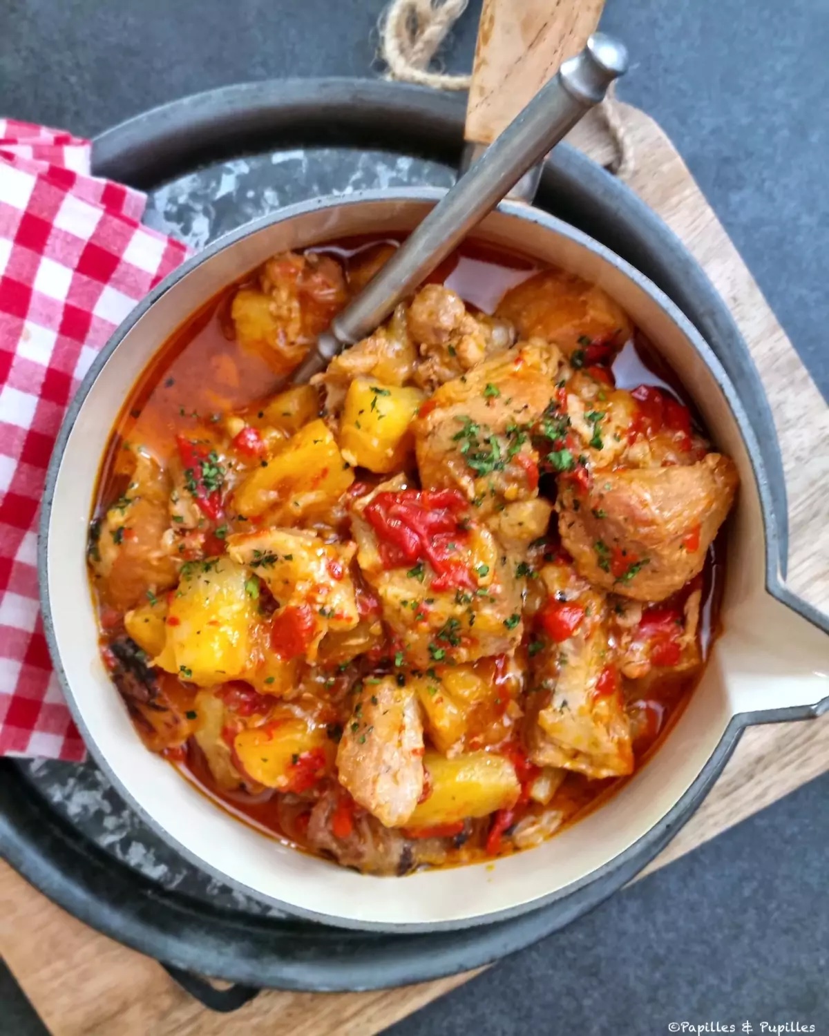 Assiette de charcuterie, sauté de porc curry/ananas, pommes de terre, fromages, tarte aux pommes, vin et pain.
